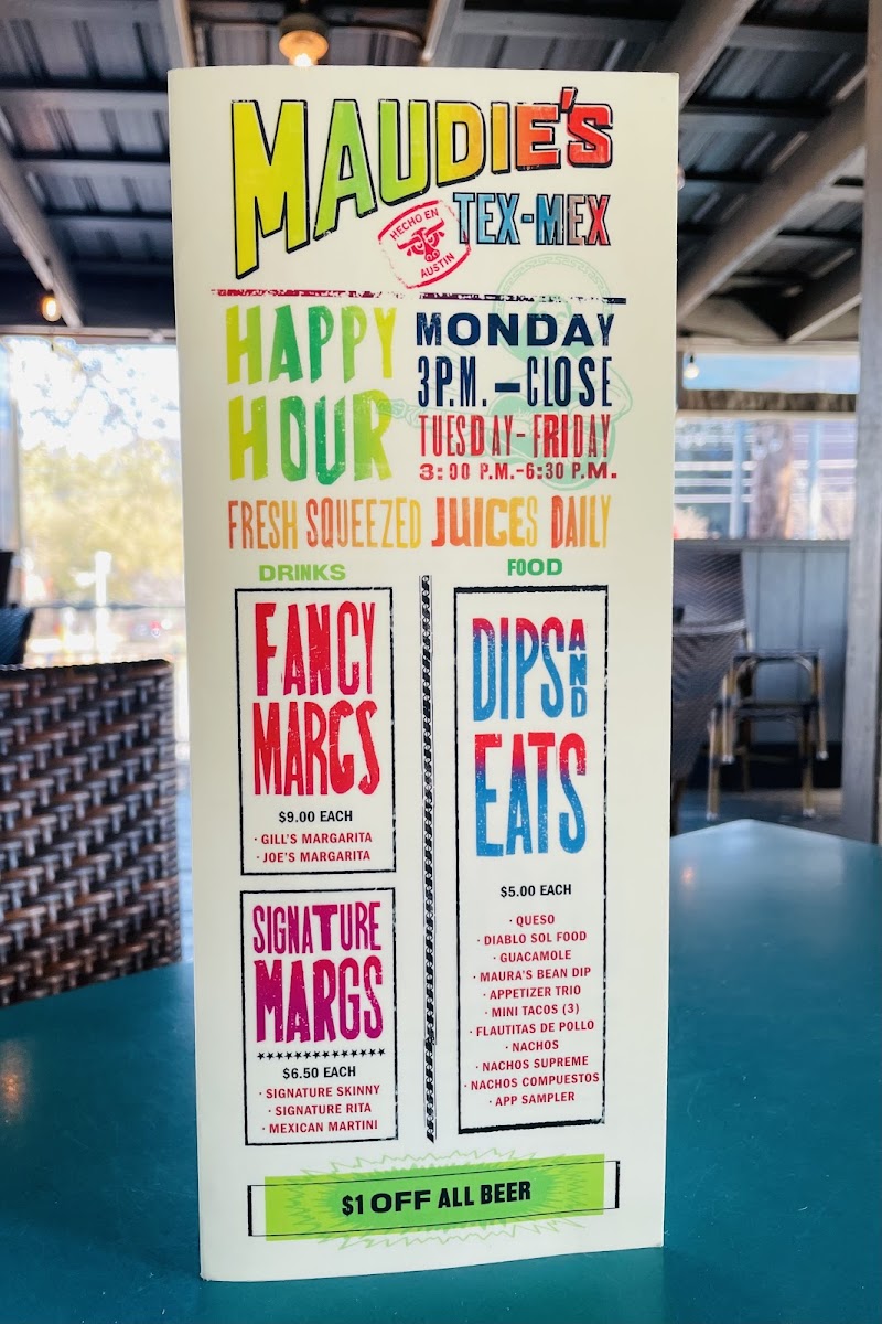 Introducing the menu at Maudie's Too, a delightful gem in Austin, TX, where Tex-Mex flavors come to life. Nestled conveniently on South Lamar Blvd, this restaurant is ideal for pre-show dinners or post-shopping bites. Guests rave about the happy hour specials, particularly the signature Mexican Martini that perfectly complements the vibrant atmosphere.